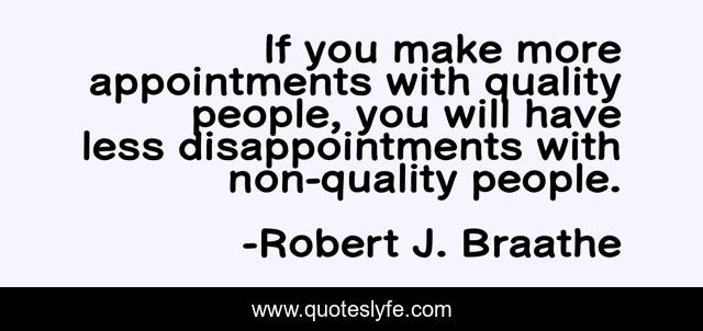 This page presents the quote "If you make more appointments with quality people, you will have less disappointments with non-quality people.". Author of this quote is Robert J. Braathe. This quote is about appointment, disappointment,.