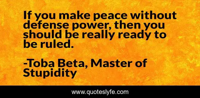 This page presents the quote "If you make peace without defense power, then you should be really ready to be ruled.". Author of this quote is Toba Beta, Master of Stupidity. This quote is about ready, defense, make-peace, power, ruled,.
