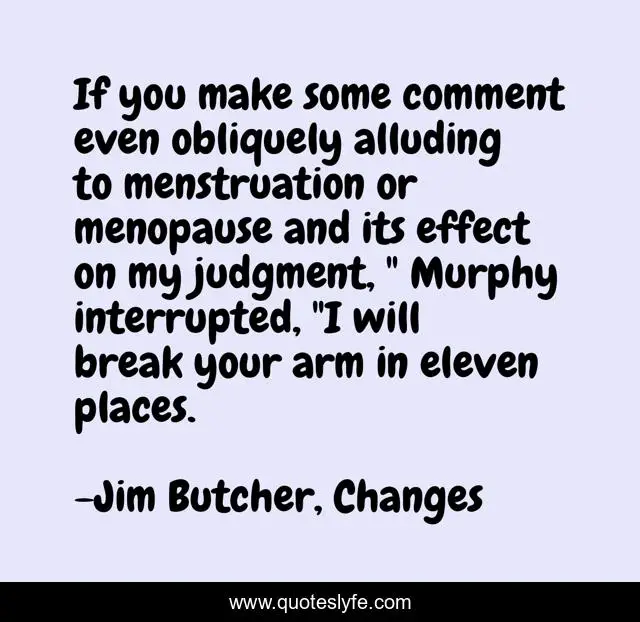 This page presents the quote "If you make some comment even obliquely alluding to menstruation or menopause and its effect on my judgment, " Murphy interrupted, "I will break your arm in eleven places.". Author of this quote is Jim Butcher, Changes. This quote is about karrin-murphy, humor, feminism,.