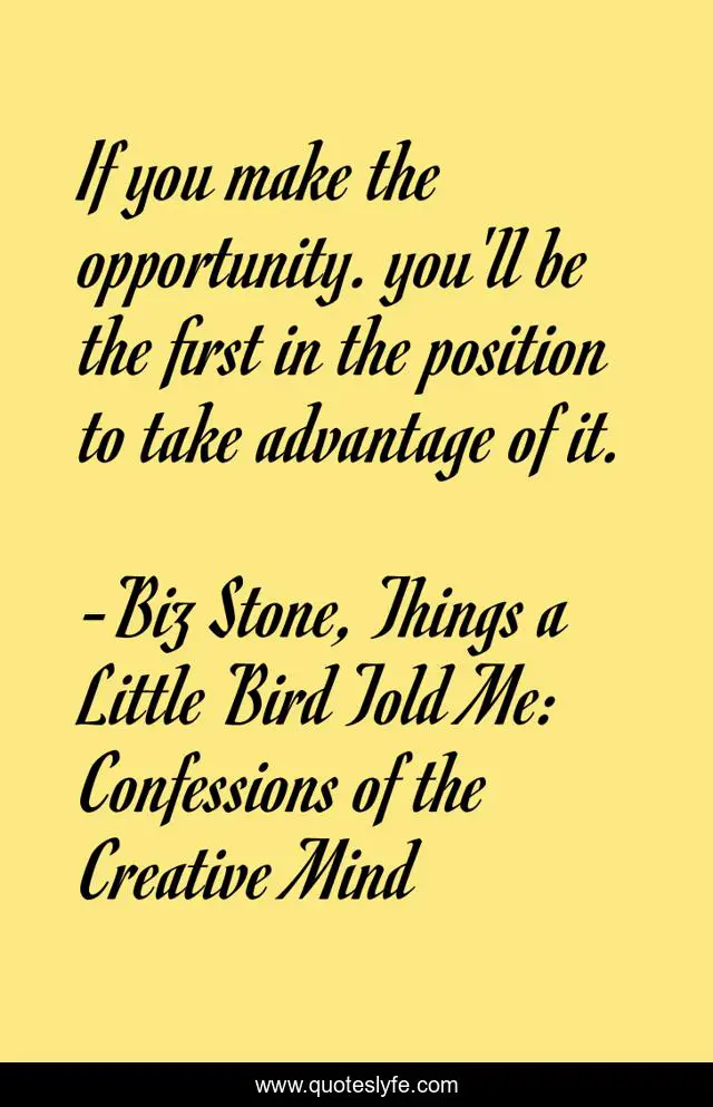 This page presents the quote "If you make the opportunity. you'll be the first in the position to take advantage of it.". Author of this quote is Biz Stone, Things a Little Bird Told Me: Confessions of the Creative Mind. This quote is about success, entrepreneurship, goal-setting, inspirational, enthusiasm, opportunity-life,.