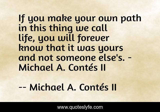 This page presents the quote "If you make your own path in this thing we call life, you will forever know that it was yours and not someone else's. - Michael A. Contés II". Author of this quote is - Michael A. Contés II. This quote is about confidence, positive, motivational, optimistic, inspirational, thoughts-on-life, enthusiasm, philosphy, inspiration,.
