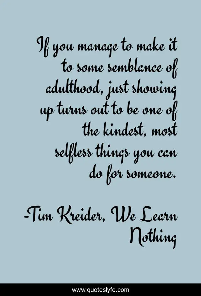 This page presents the quote "If you manage to make it to some semblance of adulthood, just showing up turns out to be one of the kindest, most selfless things you can do for someone.". Author of this quote is Tim Kreider, We Learn Nothing. This quote is about kindness, adulthood,.