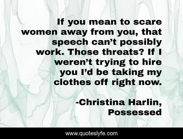 This page presents the quote "If you mean to scare women away from you, that speech can’t possibly work. Those threats? If I weren’t trying to hire you I’d be taking my clothes off right now.". Author of this quote is Christina Harlin, Possessed. This quote is about ghost, possession, ghost-hunters, paranormal-romance, haunting, paranormal-thriller,.