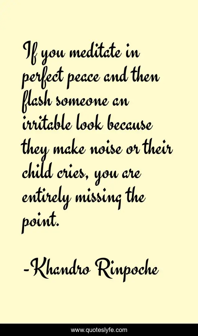 This page presents the quote "If you meditate in perfect peace and then flash someone an irritable look because they make noise or their child cries, you are entirely missing the point.". Author of this quote is Khandro Rinpoche. This quote is about meditation, mindfulness, conduct, hypocrisy,.
