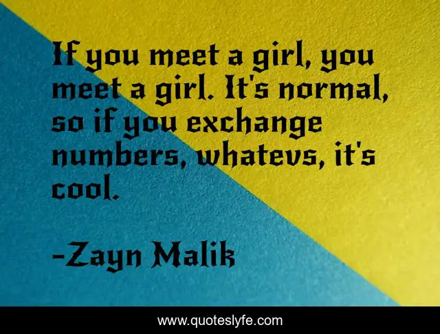 This page presents the quote "If you meet a girl, you meet a girl. It's normal, so if you exchange numbers, whatevs, it's cool.". Author of this quote is Zayn Malik. This quote is about girl, numbers,.