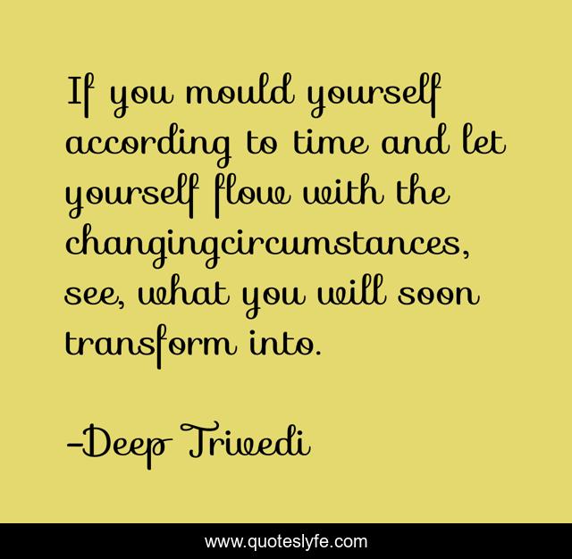 This page presents the quote "If you mould yourself according to time and let yourself flow with the changingcircumstances, see, what you will soon transform into.". Author of this quote is Deep Trivedi. This quote is about the-pulse-of-wisdom, deep-trivedi, change-with-time, transform, time, quotes-to-live-by, wisdom,.