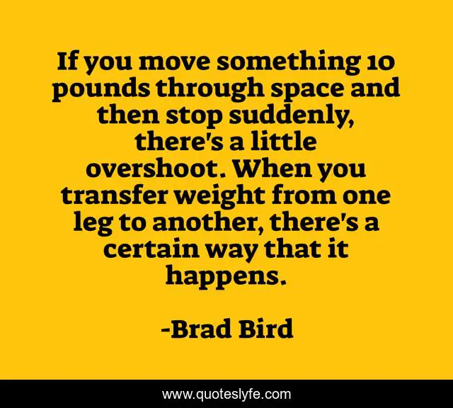 This page presents the quote "If you move something 10 pounds through space and then stop suddenly, there's a little overshoot. When you transfer weight from one leg to another, there's a certain way that it happens.". Author of this quote is Brad Bird. This quote is about through, way,.