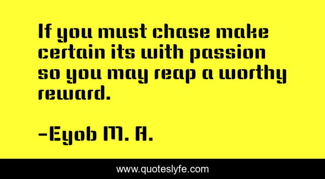 This page presents the quote "If you must chase make certain its with passion so you may reap a worthy reward.". Author of this quote is Eyob M. A.. This quote is about desire, life, passion, goal, success,.