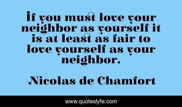 This page presents the quote "If you must love your neighbor as yourself it is at least as fair to love yourself as your neighbor.". Author of this quote is Nicolas de Chamfort. This quote is about self, acceptance,.