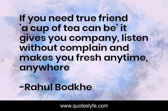 This page presents the quote "If you need true friend 'a cup of tea can be' it gives you company, listen without complain and makes you fresh anytime, anywhere". Author of this quote is Rahul Bodkhe. This quote is about love, friendliness, friends, romance, friendship-true-and-loyal, friends-to-lovers, friend, friendship-and-love, friendship,.