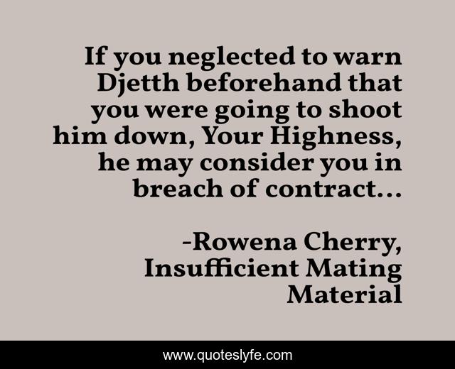 This page presents the quote "If you neglected to warn Djetth beforehand that you were going to shoot him down, Your Highness, he may consider you in breach of contract...". Author of this quote is Rowena Cherry, Insufficient Mating Material. This quote is about alien-romance, humor, humour, romance, fantasy, futuristic,.