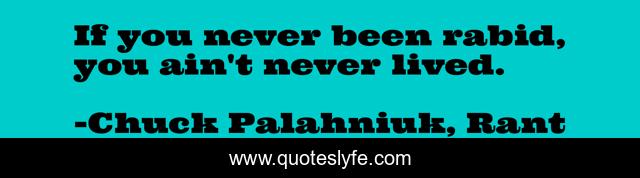 This page presents the quote "If you never been rabid, you ain't never lived.". Author of this quote is Chuck Palahniuk, Rant. This quote is about living, life, rabid,.