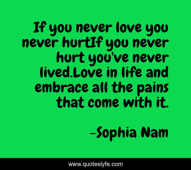 This page presents the quote "If you never love you never hurtIf you never hurt you've never lived.Love in life and embrace all the pains that come with it.". Author of this quote is Sophia Nam. This quote is about life, love, hurt, inspirational, enthusiasm, pain, affection,.