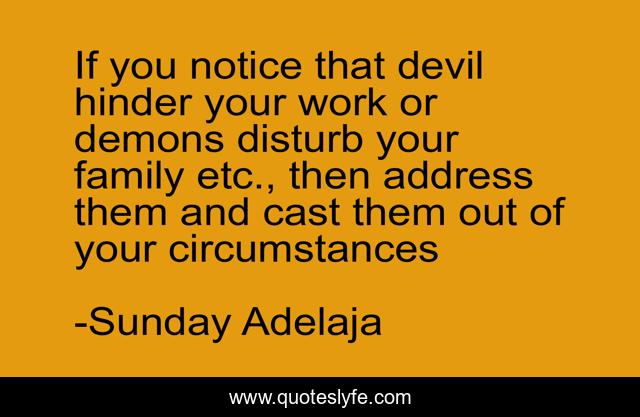 This page presents the quote "If you notice that devil hinder your work or demons disturb your family etc., then address them and cast them out of your circumstances". Author of this quote is Sunday Adelaja. This quote is about devil, demons, prayer,.