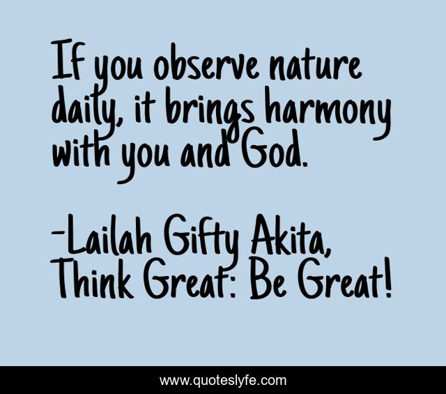 "Lailah Gifty Akita, Think Great: Be Great! Quotes." Quoteslyfe.com, 2025. Sat. 06 Dec. 2025. <https://www.quoteslyfe.com/quote/If-you-observe-nature-daily-it-brings-85609>.