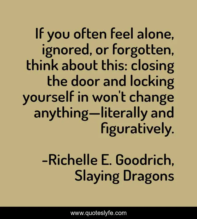 This page presents the quote "If you often feel alone, ignored, or forgotten, think about this: closing the door and locking yourself in won't change anything—literally and figuratively.". Author of this quote is Richelle E. Goodrich, Slaying Dragons. This quote is about ignored, self-pity, richelle-e-goodrich, self-worth, reaching-out, richelle, forgotten, alone, richelle-goodrich,.