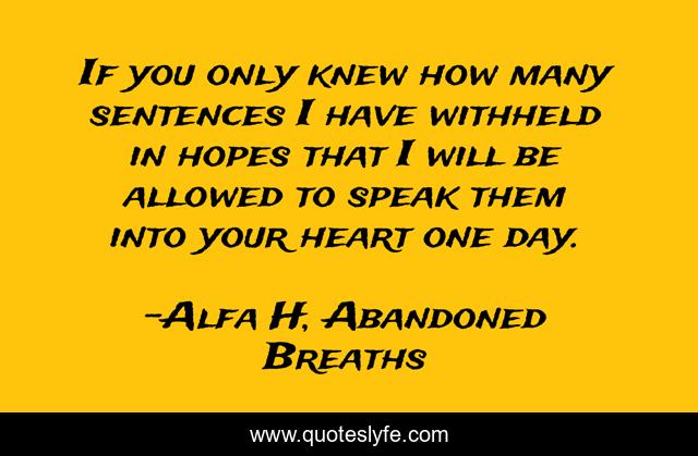 This page presents the quote "If you only knew how many sentences I have withheld in hopes that I will be allowed to speak them into your heart one day.". Author of this quote is Alfa H, Abandoned Breaths. This quote is about relationships, heart, life, love, poetry, hope, affection,.