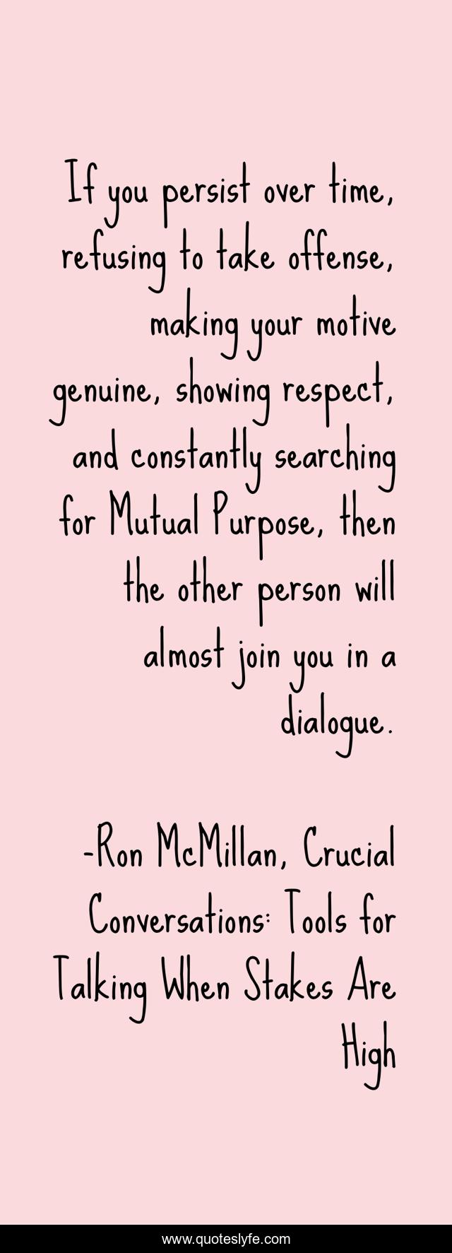 This page presents the quote "If you persist over time, refusing to take offense, making your motive genuine, showing respect, and constantly searching for Mutual Purpose, then the other person will almost join you in a dialogue.". Author of this quote is Ron McMillan, Crucial Conversations: Tools for Talking When Stakes Are High. .