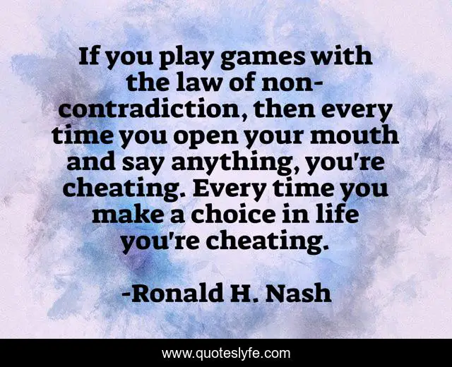This page presents the quote "If you play games with the law of non-contradiction, then every time you open your mouth and say anything, you're cheating. Every time you make a choice in life you're cheating.". Author of this quote is Ronald H. Nash. This quote is about philosophy, logic,.