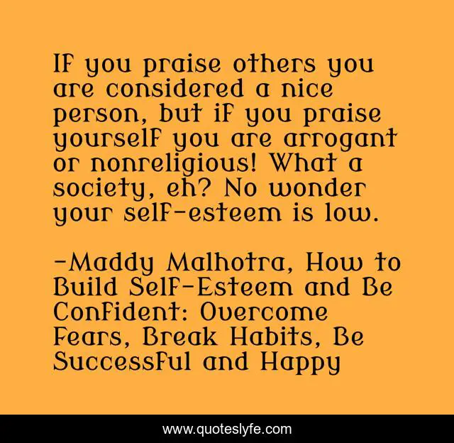 This page presents the quote "If you praise others you are considered a nice person, but if you praise yourself you are arrogant or nonreligious! What a society, eh? No wonder your self-esteem is low.". Author of this quote is Maddy Malhotra, How to Build Self-Esteem and Be Confident: Overcome Fears, Break Habits, Be Successful and Happy. This quote is about self-belief, successful-living, be-proud-of-your-true-self, self-worth,.