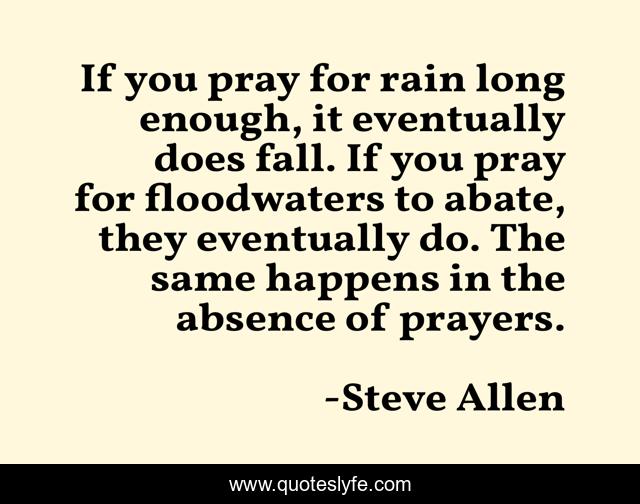This page presents the quote "If you pray for rain long enough, it eventually does fall. If you pray for floodwaters to abate, they eventually do. The same happens in the absence of prayers.". Author of this quote is Steve Allen. This quote is about comedian, writer, television-host,.