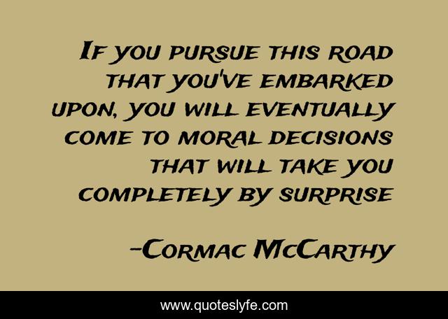 This page presents the quote "If you pursue this road that you've embarked upon, you will eventually come to moral decisions that will take you completely by surprise". Author of this quote is Cormac McCarthy. This quote is about moral-decisions, tragedy, fate, morality,.