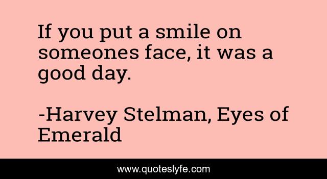 This page presents the quote "If you put a smile on someones face, it was a good day.". Author of this quote is Harvey Stelman, Eyes of Emerald. This quote is about a-curse-shaghai, romantictragedy, china, adventure, young-lady, unique, bank-robbery, high-school-graduate,.