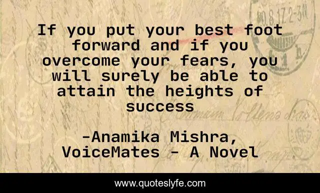 This page presents the quote "If you put your best foot forward and if you overcome your fears, you will surely be able to attain the heights of success". Author of this quote is Anamika Mishra, VoiceMates - A Novel. This quote is about life, success, career, positive, motivational, confidence, optimistic, inspirational, enthusiasm,.
