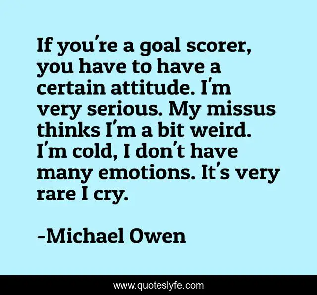 This page presents the quote "If you're a goal scorer, you have to have a certain attitude. I'm very serious. My missus thinks I'm a bit weird. I'm cold, I don't have many emotions. It's very rare I cry.". Author of this quote is Michael Owen. This quote is about weird, goal,.