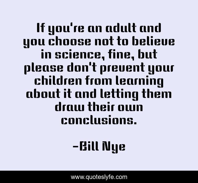 This page presents the quote "If you're an adult and you choose not to believe in science, fine, but please don't prevent your children from learning about it and letting them draw their own conclusions.". Author of this quote is Bill Nye. This quote is about believe, children, learning,.