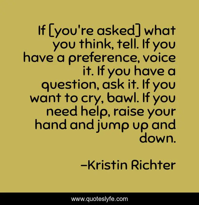 This page presents the quote "If [you're asked] what you think, tell. If you have a preference, voice it. If you have a question, ask it. If you want to cry, bawl. If you need help, raise your hand and jump up and down.". Author of this quote is Kristin Richter. This quote is about freedom, inspiration,.