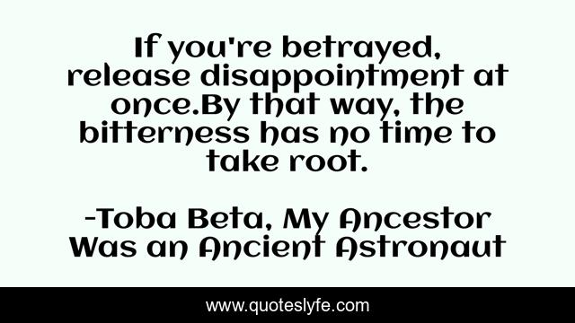 This page presents the quote "If you're betrayed, release disappointment at once.By that way, the bitterness has no time to take root.". Author of this quote is Toba Beta, My Ancestor Was an Ancient Astronaut. This quote is about take-root, betrayal, bitterness, vengeance, disappointment,.