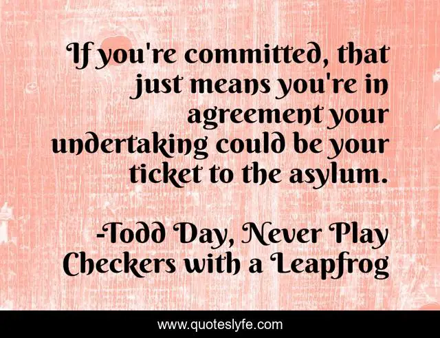 This page presents the quote "If you're committed, that just means you're in agreement your undertaking could be your ticket to the asylum.". Author of this quote is Todd Day, Never Play Checkers with a Leapfrog. This quote is about humorous, commitment,.