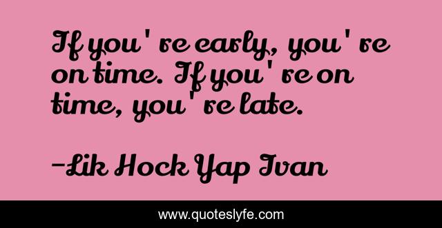 This page presents the quote "If you're early, you're on time. If you're on time, you're late.". Author of this quote is Lik Hock Yap Ivan. This quote is about time-management, positive, motivational, confidence, production, responsibility, virtue, punctuality, film,.