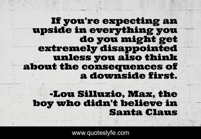 This page presents the quote "If you're expecting an upside in everything you do you might get extremely disappointed unless you also think about the consequences of a downside first.". Author of this quote is Lou Silluzio, Max, the boy who didn't believe in Santa Claus. .