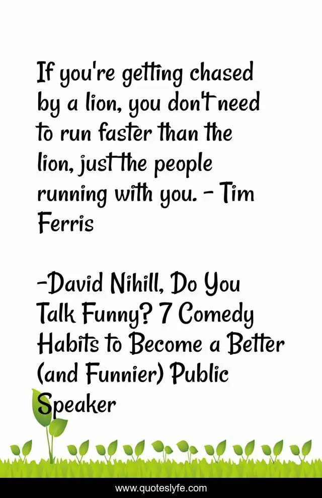 This page presents the quote "If you're getting chased by a lion, you don't need to run faster than the lion, just the people running with you. - Tim Ferris". Author of this quote is David Nihill, Do You Talk Funny? 7 Comedy Habits to Become a Better (and Funnier) Public Speaker. This quote is about survival, humour,.