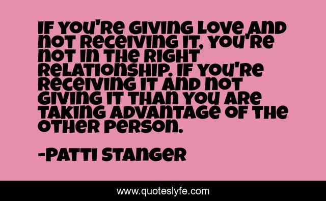 This page presents the quote "If you're giving love and not receiving it, you're not in the right relationship. If you're receiving it and not giving it than you are taking advantage of the other person.". Author of this quote is Patti Stanger. This quote is about giving, love, affection,.