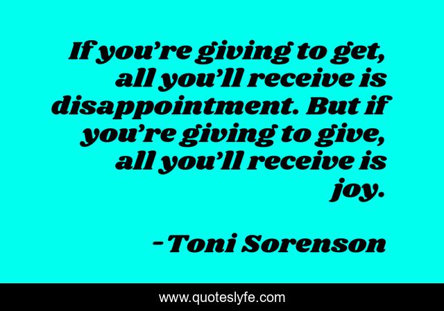 This page presents the quote "If you’re giving to get, all you’ll receive is disappointment. But if you’re giving to give, all you’ll receive is joy.". Author of this quote is Toni Sorenson. This quote is about gifts, giving, christmas, joy,.