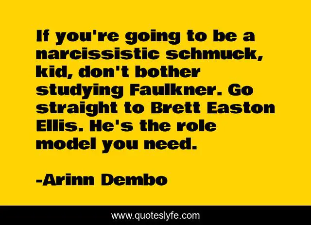 This page presents the quote "If you're going to be a narcissistic schmuck, kid, don't bother studying Faulkner. Go straight to Brett Easton Ellis. He's the role model you need.". Author of this quote is Arinn Dembo. This quote is about narcissism, faulkner, literature, humor, brett-easton-ellis,.