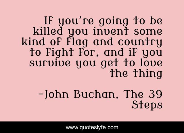This page presents the quote "If you’re going to be killed you invent some kind of flag and country to fight for, and if you survive you get to love the thing". Author of this quote is John Buchan, The 39 Steps. .