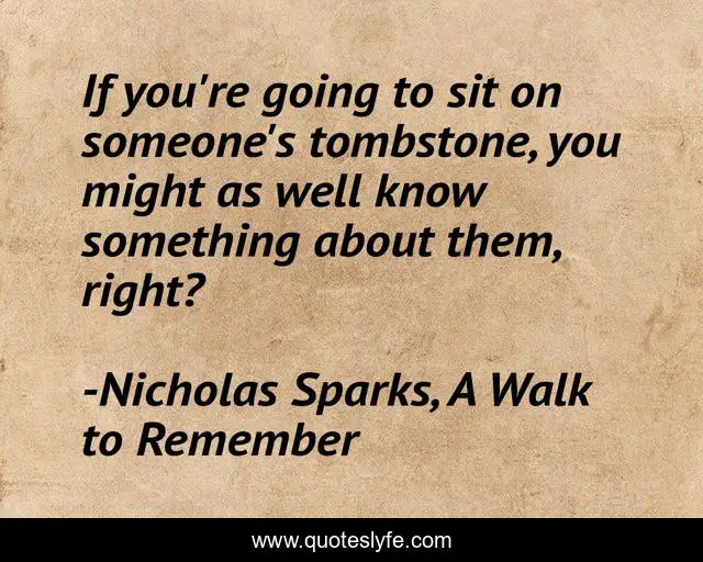 This page presents the quote "If you're going to sit on someone's tombstone, you might as well know something about them, right?". Author of this quote is Nicholas Sparks, A Walk to Remember. .