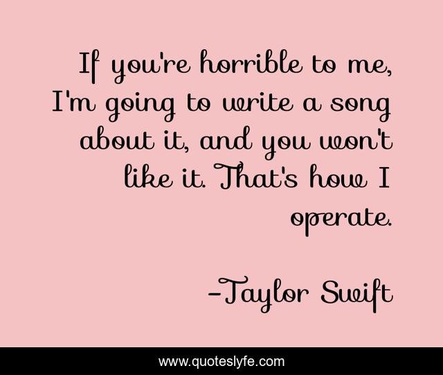 This page presents the quote "If you're horrible to me, I'm going to write a song about it, and you won't like it. That's how I operate.". Author of this quote is Taylor Swift. This quote is about humor, people, taylor-swift, bullying, inspirational, song-writing, enthusiasm, song,.