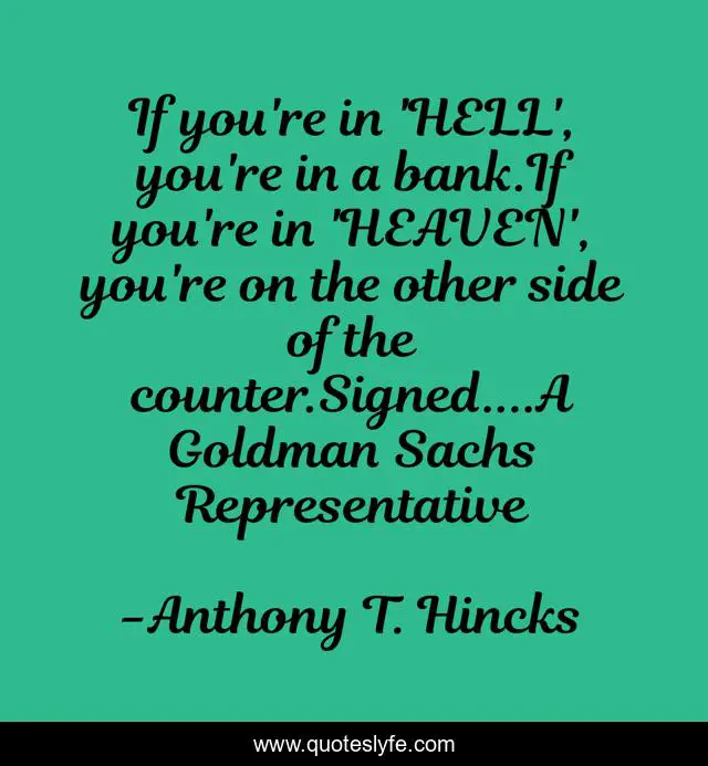 This page presents the quote "If you're in 'HELL', you're in a bank.If you're in 'HEAVEN', you're on the other side of the counter.Signed....A Goldman Sachs Representative". Author of this quote is Anthony T. Hincks. This quote is about heaven, finance, counter, goldman-sachs, philosophy, banks, hell, teller,.