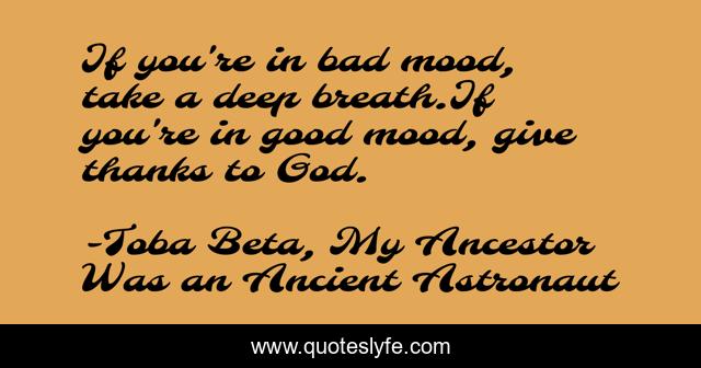 This page presents the quote "If you're in bad mood, take a deep breath.If you're in good mood, give thanks to God.". Author of this quote is Toba Beta, My Ancestor Was an Ancient Astronaut. This quote is about control, mood, yourself,.