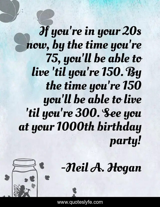 This page presents the quote "If you're in your 20s now, by the time you're 75, you'll be able to live 'til you're 150. By the time you're 150 you'll be able to live 'til you're 300. See you at your 1000th birthday party!". Author of this quote is Neil A. Hogan. This quote is about immortality, living-forever, living-in-the-present, living-life,.