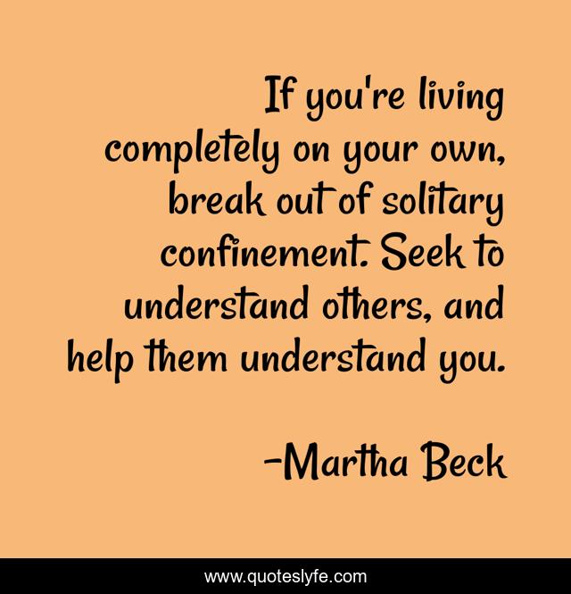 This page presents the quote "If you're living completely on your own, break out of solitary confinement. Seek to understand others, and help them understand you.". Author of this quote is Martha Beck. This quote is about living, help,.