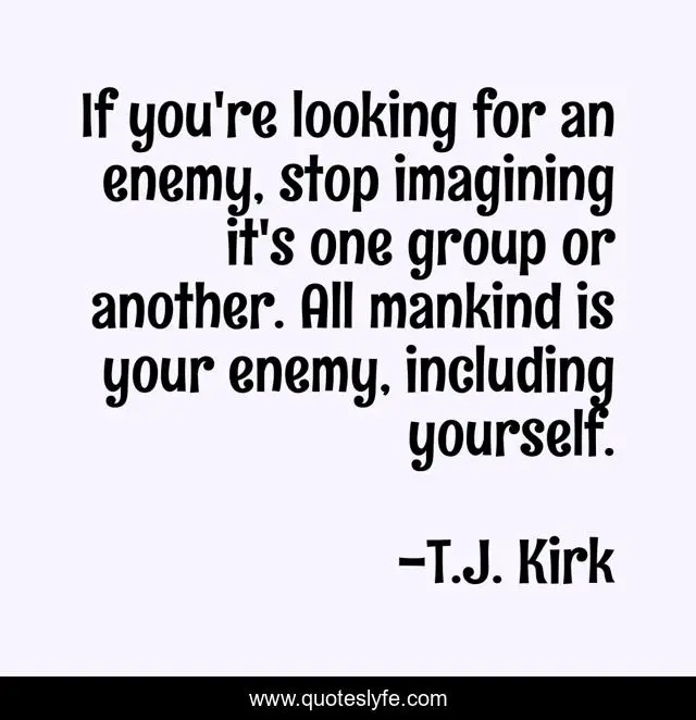 This page presents the quote "If you're looking for an enemy, stop imagining it's one group or another. All mankind is your enemy, including yourself.". Author of this quote is T.J. Kirk. This quote is about enemy, mankind,.