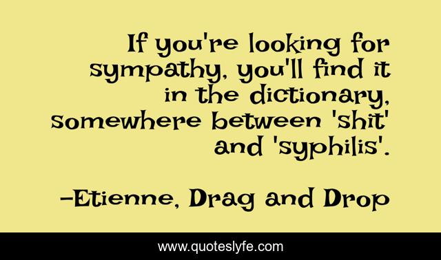 This page presents the quote "If you're looking for sympathy, you'll find it in the dictionary, somewhere between 'shit' and 'syphilis'.". Author of this quote is Etienne, Drag and Drop. .