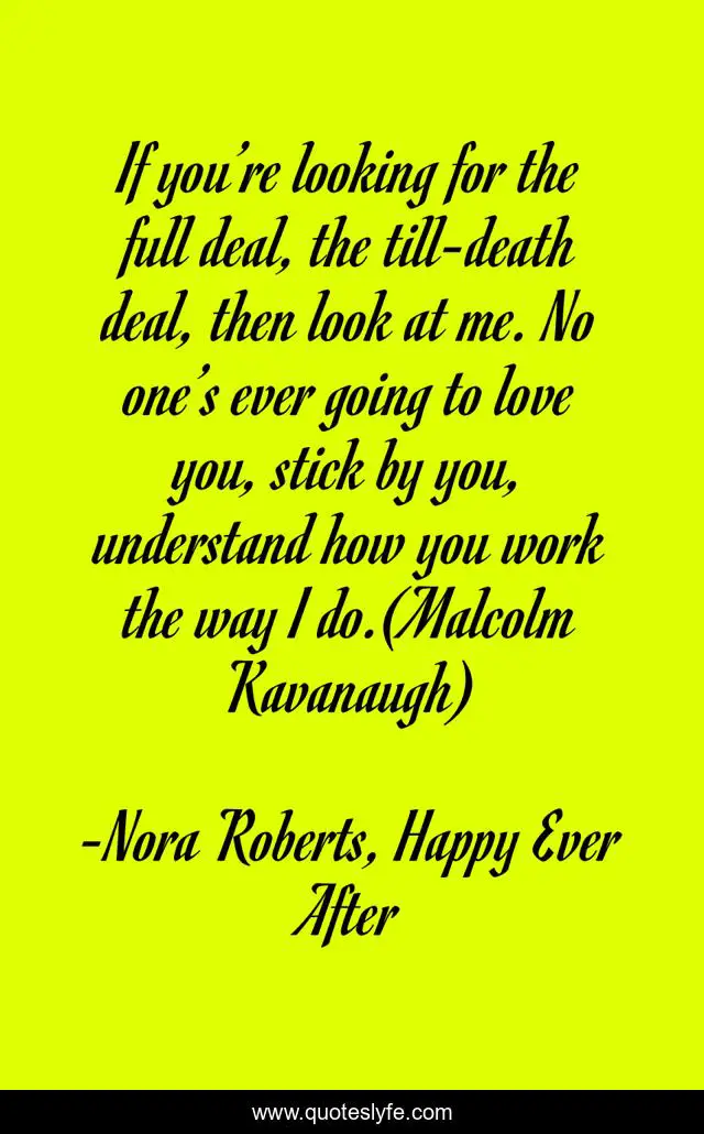 This page presents the quote "If you’re looking for the full deal, the till-death deal, then look at me. No one’s ever going to love you, stick by you, understand how you work the way I do.(Malcolm Kavanaugh)". Author of this quote is Nora Roberts, Happy Ever After. This quote is about forever, love, affection,.