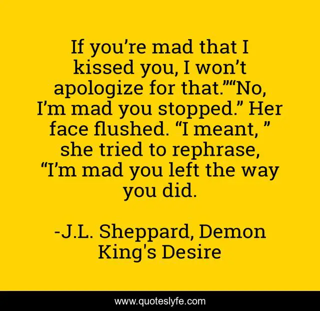This page presents the quote "If you’re mad that I kissed you, I won’t apologize for that.”“No, I’m mad you stopped.” Her face flushed. “I meant, ” she tried to rephrase, “I’m mad you left the way you did.". Author of this quote is J.L. Sheppard, Demon King's Desire. This quote is about romance, paranormal, paranormal-romance,.